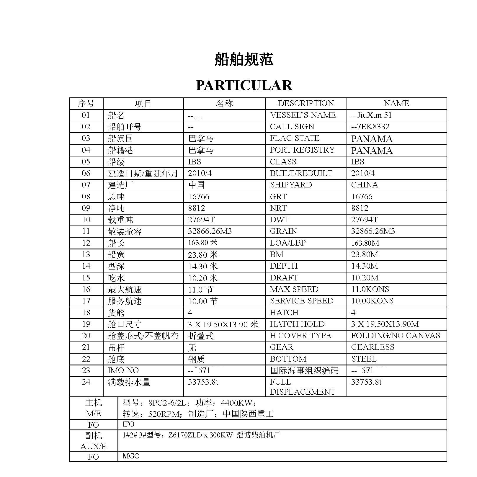 Main Engine: 8PC2-6/2L Shaanchai;